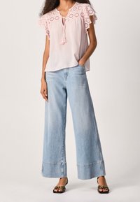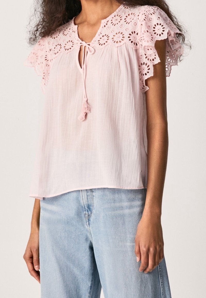 Femme portant un haut rose pâle avec des épaules en dentelle florale et un lien à franges, associé à un jean taille haute bleu clair.