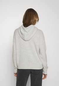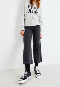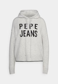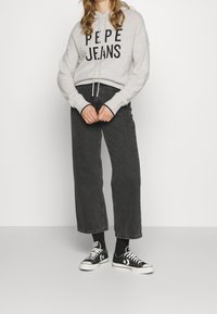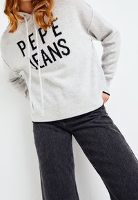 Personne portant un sweat à capuche Pepe Jeans gris clair avec texte noir et un jean en denim gris foncé, debout les mains sur les hanches.