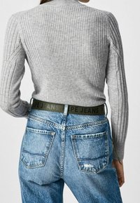Pull à col roulé côtelé gris avec manches longues, associé à un jean en denim bleu taille haute, agrémenté d'une ceinture noire et verte avec logo.