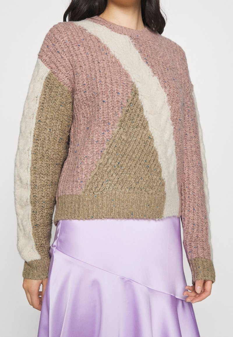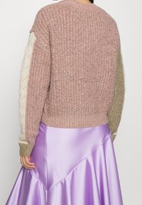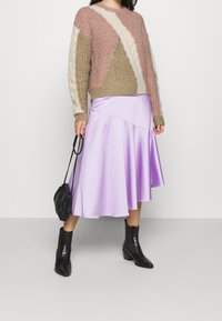 Femme portant un pull en maille texturée avec des blocs de couleur rose, beige et blanc, associé à une jupe en satin lavande brillante.