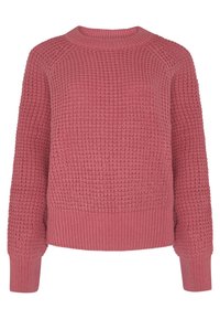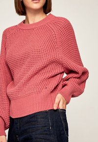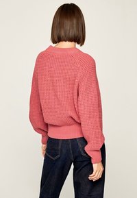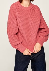 Pull rose en tricot avec un motif texturé, col et poignets côtelés. Porté avec un denim foncé, affichant une coupe décontractée et oversize.