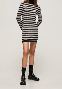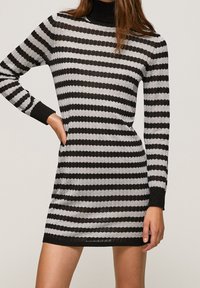 Robe rayée noire et argentée avec un col montant et des manches longues, présentant un motif en maille texturée et une silhouette ajustée.