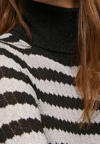 Robe rayée noire et argentée avec un col haut, des manches longues, une silhouette ajustée et des poignets côtelés. Tissu texturé avec un effet scintillant.