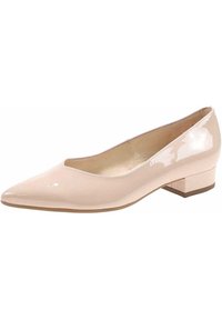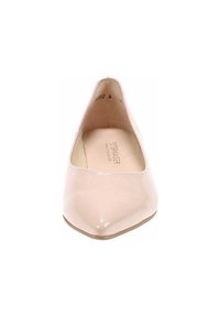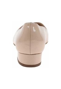 Escarpin en cuir verni rose pâle avec un bout pointu et un petit talon carré. Texture lisse sans motifs ni accents.