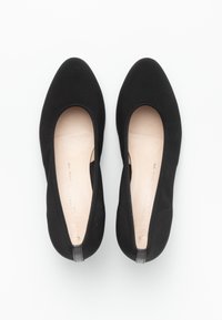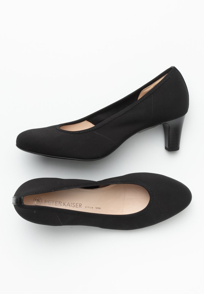 Une paire de chaussures à talons bas noires pour femmes avec des bouts ronds, présentées en vues latérales et de dessus sur un fond blanc.