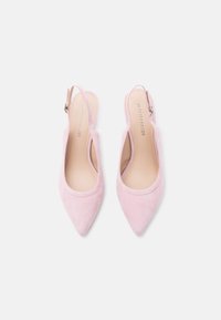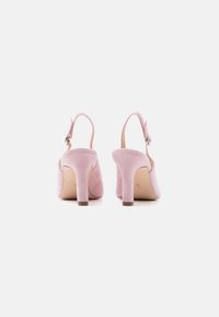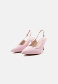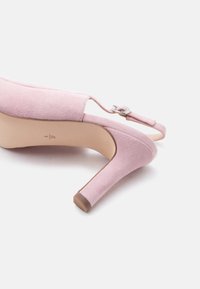 Escarpin rose en daim avec talon haut, bride arrière et bout pointu, doté d'une sangle à boucle réglable, présenté sur un fond blanc uni.