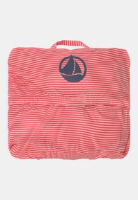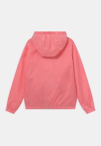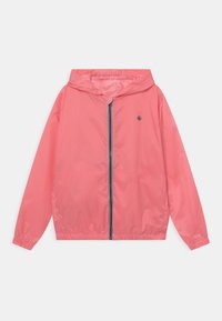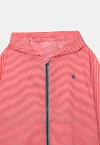 Veste légère à rayures rouges avec capuche, fermeture éclair complète, poignets élastiques et petit logo sur la poitrine gauche. Matière lisse et résistante à l'eau.