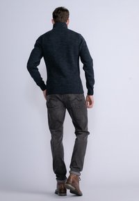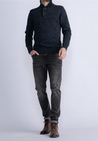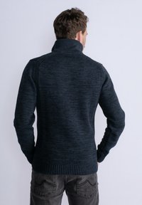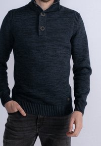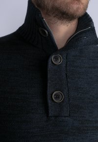 Pull en maille bleu foncé avec col montant, deux boutons, poignets et ourlet côtelés, présentant un motif texturé et une petite étiquette logo.