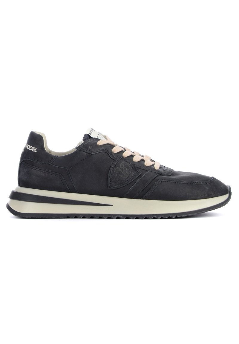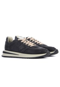 Baskets en daim noir avec des lacets beige, une semelle épaisse beige et un logo embossé sur le côté, vues de profil droit.