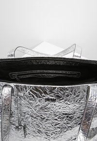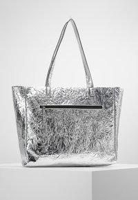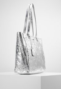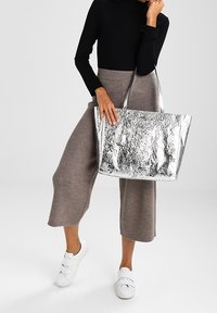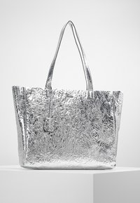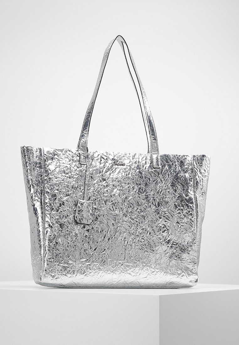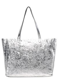 Sac fourre-tout argenté avec texture froissée, forme rectangulaire, longues anses et petite étiquette détachable. Finition métallique lisse.