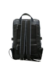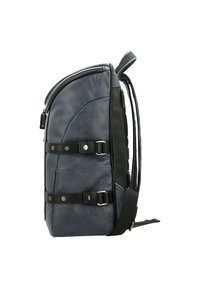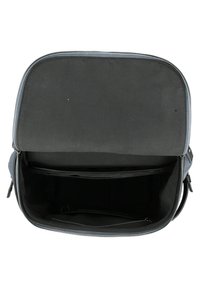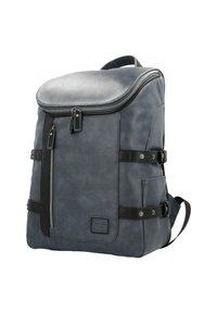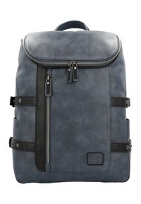 Sac à dos en cuir synthétique bleu texturé avec fermeture à rabat et double fermeture éclair. Comprend des bretelles noires et des accents sur les côtés.