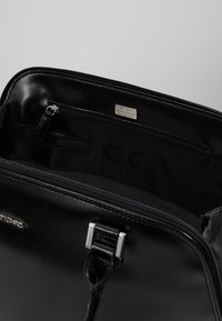 Sac à main en cuir noir avec deux longues anses, fermeture éclair argentée et petite plaque métallique de marque, présenté sur un socle blanc sur un fond gris.