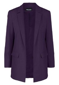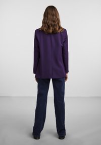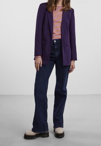 Femme portant un blazer violet sur une chemise à manches longues rayée orange et violet, et un jean bleu foncé, debout devant un fond clair uni.