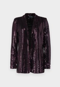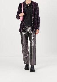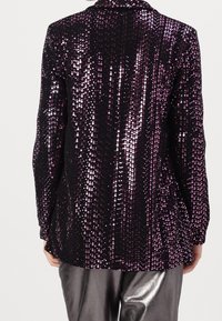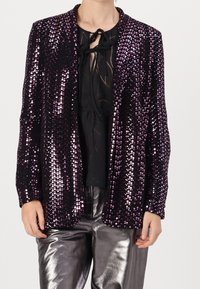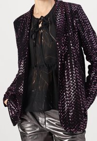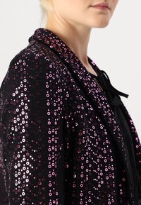 Veste noire recouverte de sequins roses brillants, avec un devant ouvert et un col standard. Portée sur un haut noir et un pantalon argenté.