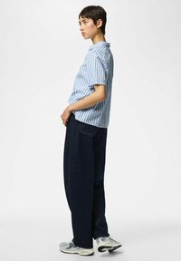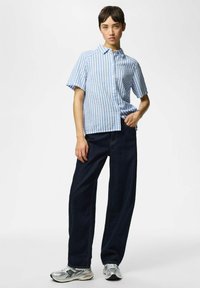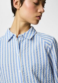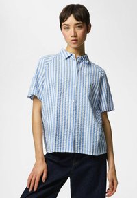 Jeune personne aux cheveux courts et foncés portant une chemise à manches courtes à rayures verticales bleues et blanches et un pantalon foncé, sur fond blanc.