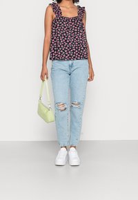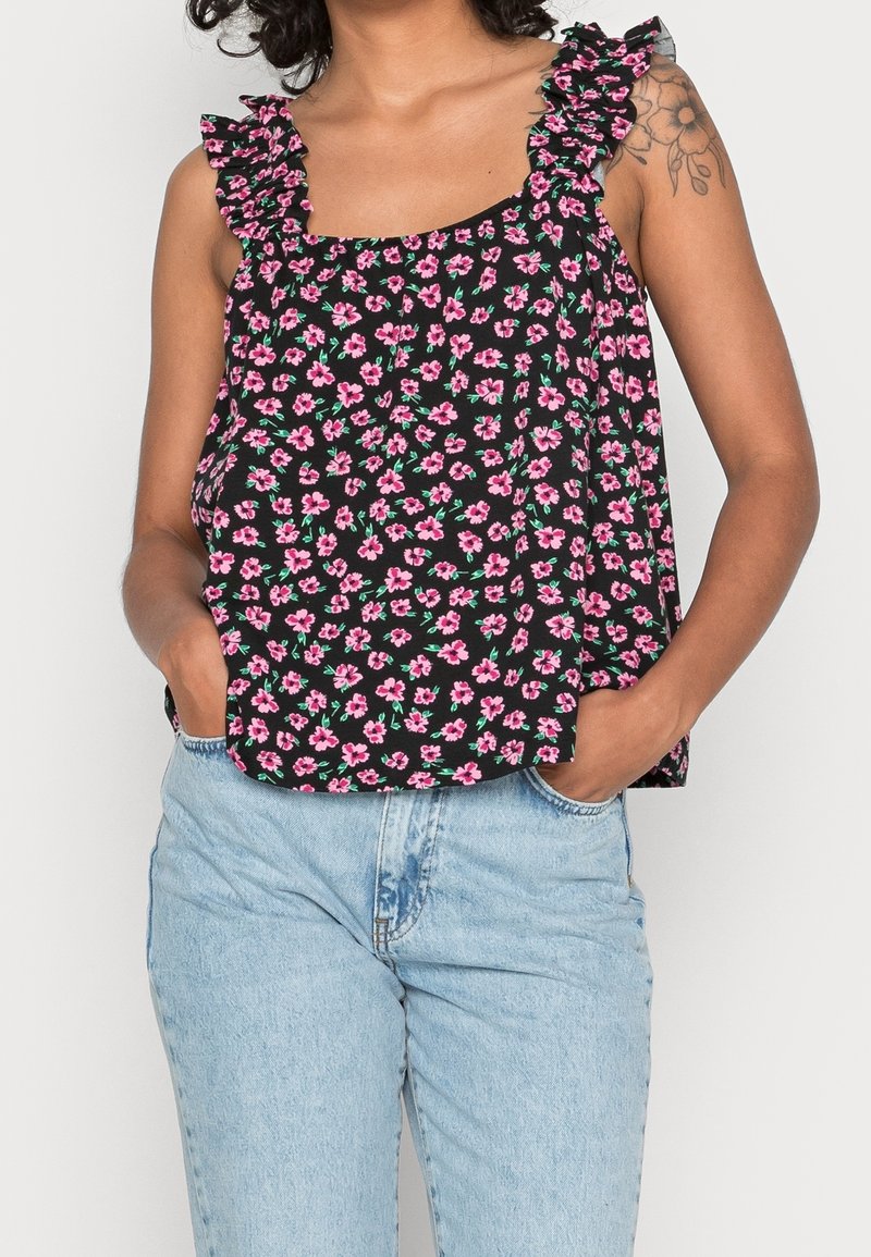 Haut sans manches noir avec des bretelles volantes, arborant un motif floral dans les tons rose et vert. Associé à un jean taille haute bleu clair.