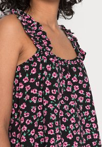 Haut noir à fleurs avec bretelles ajustables, présentant des fleurs roses et jaunes, un col froncé et une coupe ample. Tissu léger et texturé.
