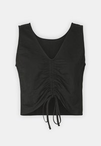 Haut noir sans bretelles en tissu doux et extensible avec une texture froncée, associé à un jean en denim bleu taille haute.
