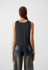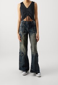 Femme portant un haut court noir froncé sans manches et un jean cargo délavé taille haute avec plusieurs poches.