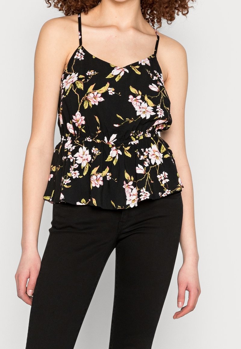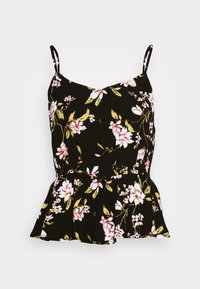 Top péplum floral en tissu noir, doté de fleurs roses, de bretelles fines et d'une taille élastique pour un ajustement décontracté. Associé à un jean noir.