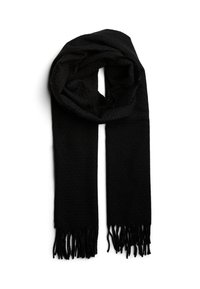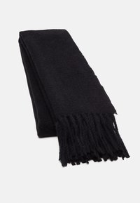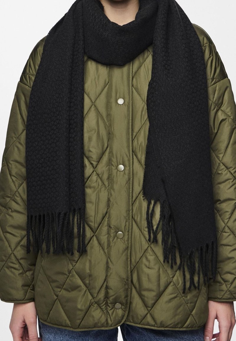 Personne portant une veste matelassée vert olive avec des boutons-pression et une épaisse écharpe noire texturée aux extrémités frangées.