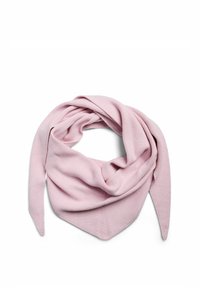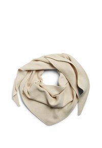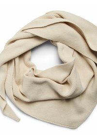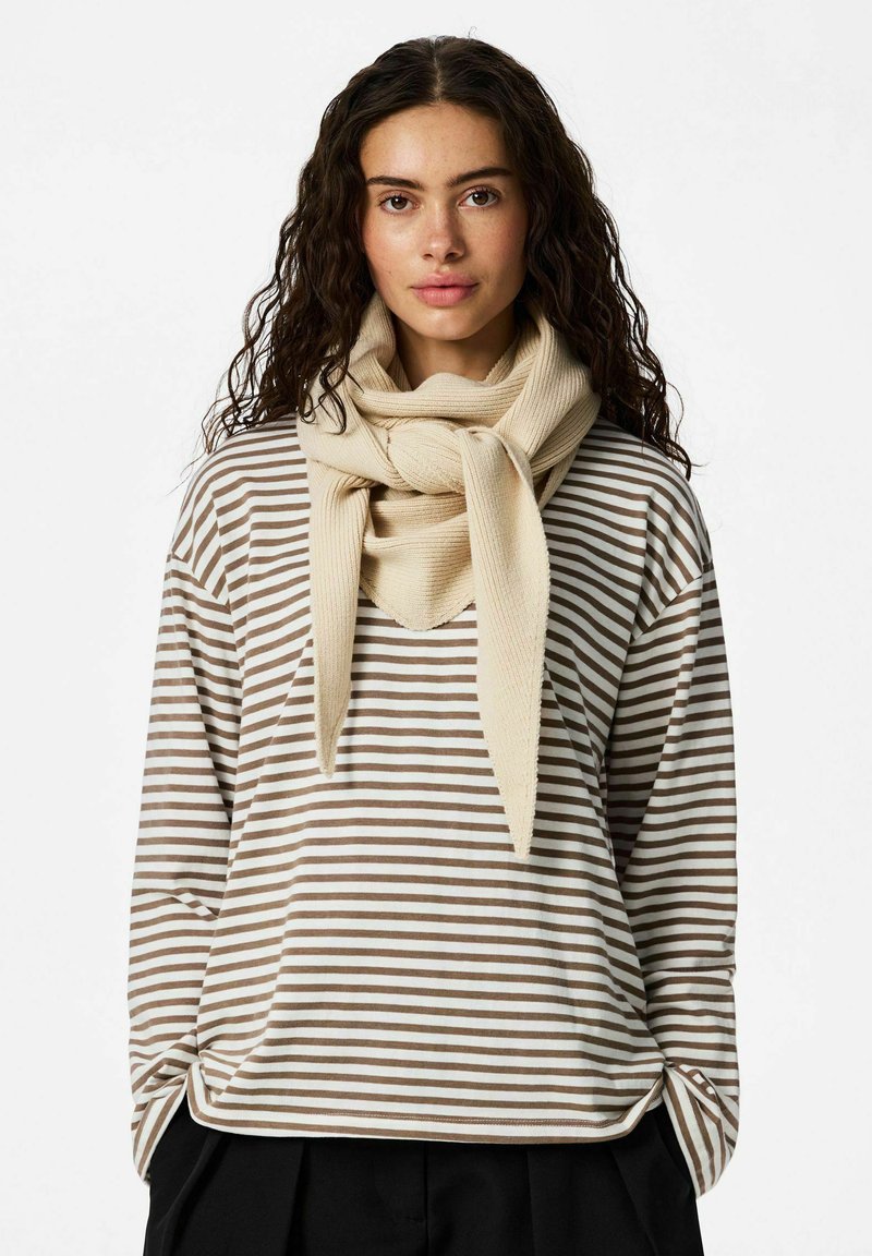 Jeune femme aux cheveux bouclés portant une écharpe beige et un chemisier à manches longues rayé marron et blanc, debout devant un fond uni.