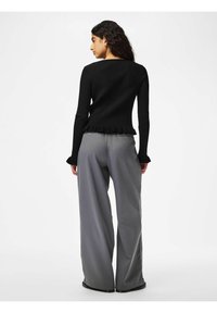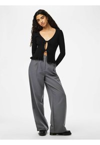 Femme aux cheveux bouclés portant un cardigan côtelé noir noué à l'avant et un pantalon gris à fines rayures, mains dans les poches, expression neutre.