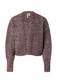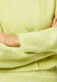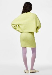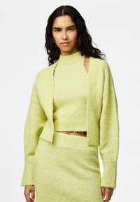 Femme aux cheveux bouclés foncés portant un ensemble en maille jaune pâle composé d'un pull court, d'un cardigan ouvert et d'une jupe taille haute assortie.