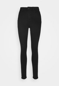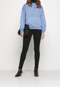 Personne portant un jean noir taille haute ajusté, un haut noir à manches longues et des bottines à talons noires, debout devant un fond clair uni.