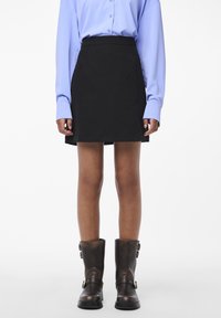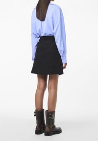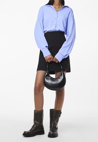 Femme portant une jupe noire longueur genou, une chemise bleu clair à manches longues boutonnée, et des bottes marron foncé à boucles, debout sur un fond blanc.