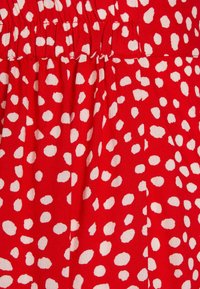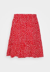Jupe rouge à pois blancs, avec un ourlet à volants et une taille ajustée. Fabriquée en tissu léger à texture lisse.