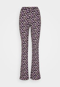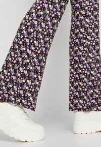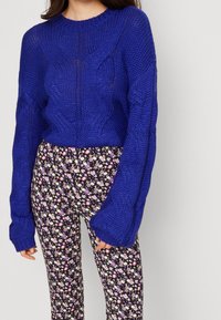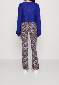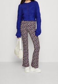 Pantalon évasé en tissu noir avec un motif floral comprenant des fleurs roses, blanches et jaunes. Associé à un pull en tricot bleu.
