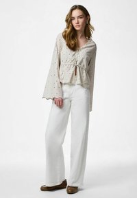 Jeune femme aux cheveux blonds ondulés portant un chemisier beige à œillets avec des manches larges et un pantalon blanc, mains dans les poches, expression neutre.