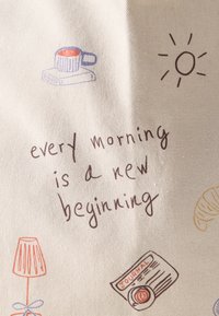 Sac cabas beige avec de longues anses, décoré de petites illustrations et du texte "chaque matin est un nouveau départ."