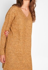 Robe-pull en maille côtelée jaune moutarde avec un col en V et des manches longues, dotée d'un tissu texturé et d'une coupe décontractée.