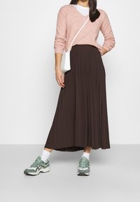 Femme portant un pull léger rose pâle à col en V, rentré dans une jupe plissée taille haute de couleur marron foncé, sur un fond blanc uni.