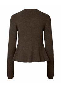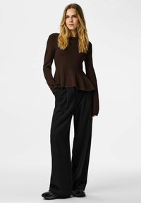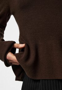 Femme aux longs cheveux blonds portant un pull à manches longues marron foncé et un pantalon noir à fines rayures, mains dans les poches, regardant légèrement vers la gauche.