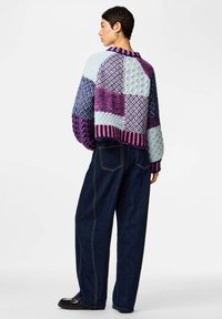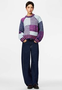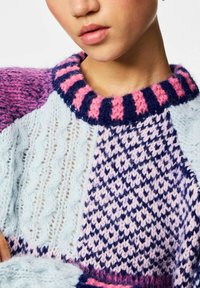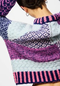 Femme portant un pull en tricot patchwork coloré avec des motifs roses, violets et bleus, associé à un jean bleu foncé, debout avec la main dans la poche.