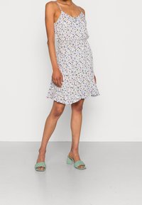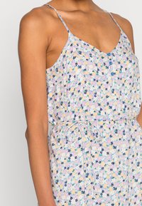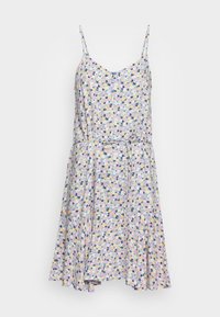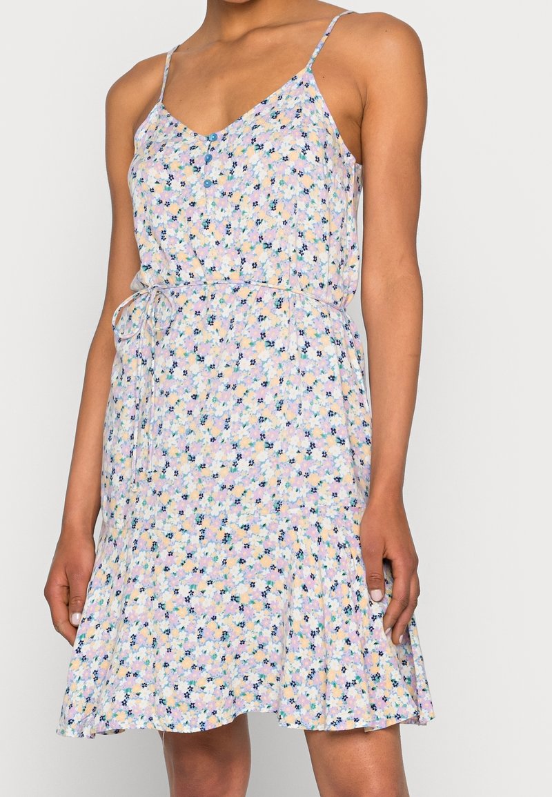 Robe florale dans des couleurs pastel légères, avec des bretelles spaghetti, un décolleté en V, un lien à la taille et un ourlet fluide.