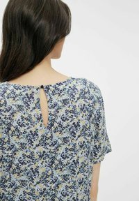 Robe marine avec imprimé floral blanc, manches courtes, encolure ronde et détail en forme de trou de serrure au dos. Le tissu semble doux et lisse.