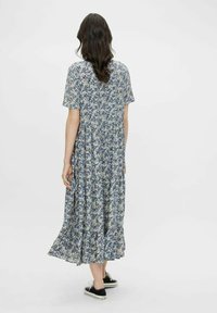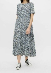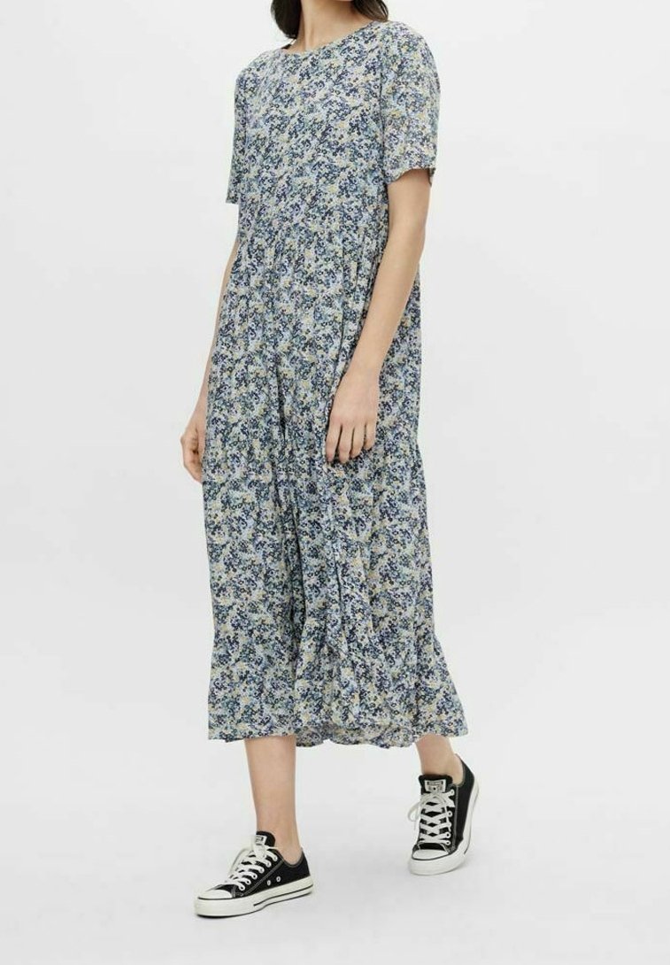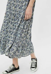 Femme portant une robe midi à fleurs bleues et blanches à manches courtes, associée à des baskets noires et blanches, debout sur un fond blanc.