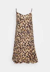 Robe à imprimé léopard beige avec des taches noires et orange, dotée de bretelles spaghetti réglables et d'un ourlet évasé à volants.
