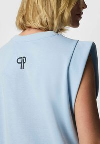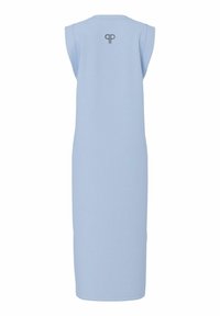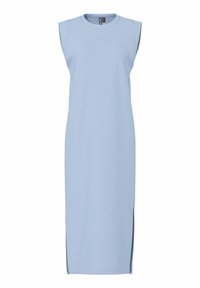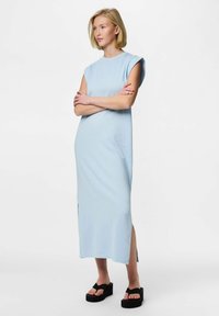 Femme portant une robe midi sans manches bleu clair avec des fentes latérales, une ceinture en crochet crème et des sandales noires à plateforme, debout sur un fond blanc.