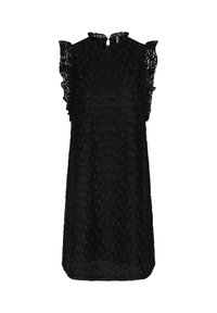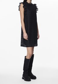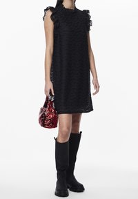 Robe noire en tissu texturé, avec des manches courtes volantées et un col rond. La coupe trapèze offre une tenue ample et décontractée.