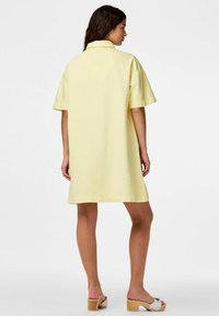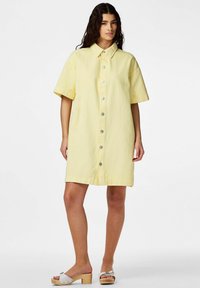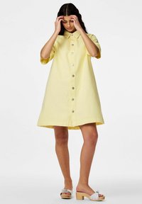 Femme debout portant une robe jaune à manches courtes avec boutons à l'avant et des sandales blanches à talons sur un fond blanc uni.
