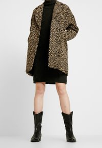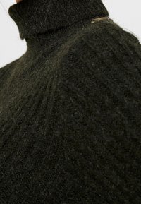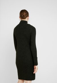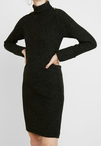 Robe en maille côtelée noire avec col montant, manches longues et boutons décoratifs sur les épaules ; silhouette ajustée atteignant le milieu des cuisses.