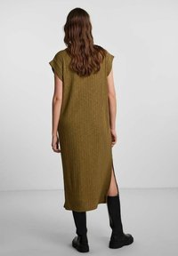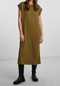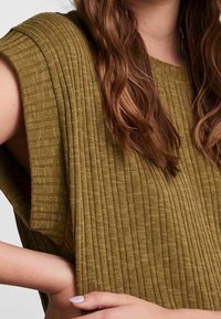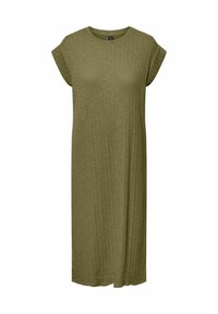 Robe sans manches de couleur olive, avec des côtes verticales, un col rond et une coupe décontractée, tombant au-dessus des genoux.