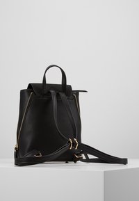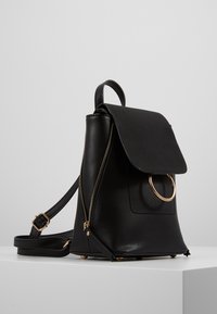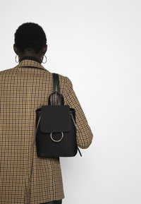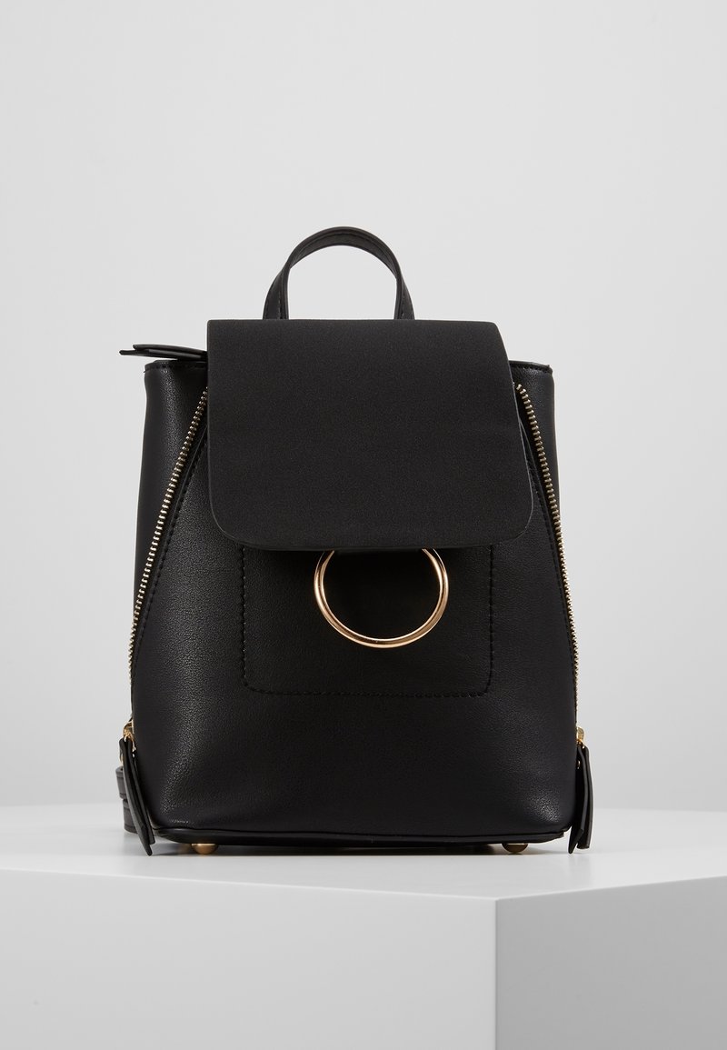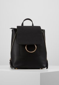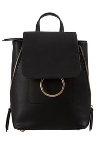 Sac à dos en cuir noir avec rabat, détail anneau circulaire doré, fermetures éclair sur les côtés, et poignée supérieure, posé sur une surface blanche devant un fond gris.