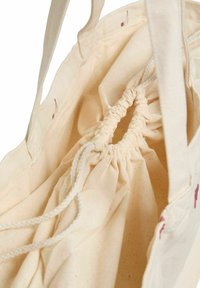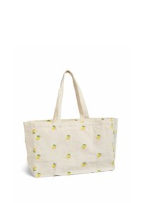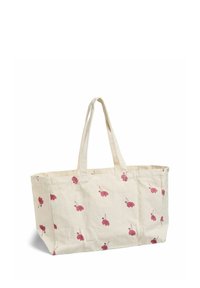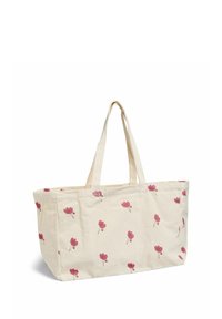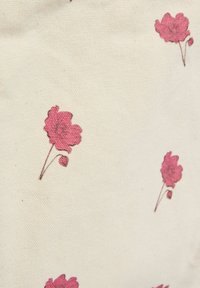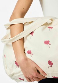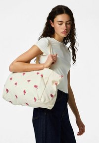 Jeune femme en t-shirt blanc et jean foncé portant un sac fourre-tout crème à fleurs roses sur l'épaule.