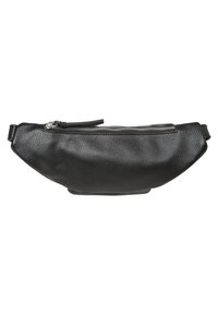 Sac banane en cuir noir texturé avec deux compartiments zippés et de longues tirettes de fermeture éclair sur fond blanc.